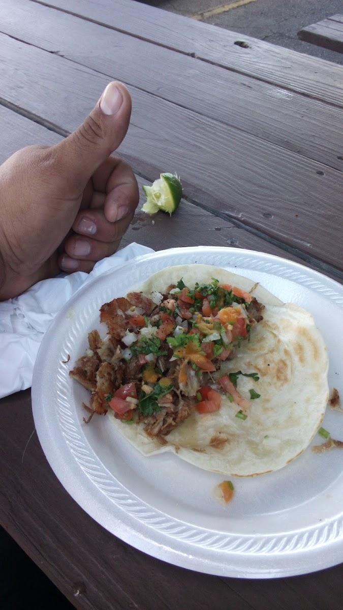 I had the AJ Taco which was delicious, this taco has egg, potato, sausage, bacon, and cheese. This taco was BIG and heavy. I was very satisfied with the food. The flour tortilla was tasty and thin as I like it. They took around 5m to prepare it fresh. They offer two salsas, (red and green), I liked the red one more. As for the atmosphere, it's a food truck next to a road and a gas station so I wouldn't eat there but they do have a seating area if you want to enjoy your food on the go. They have a phone# you can call to order your food, the menu is pretty diverse. They take cards and cash. The prices are decent, $3.50 for the AJ taco is a good deal I'd say.